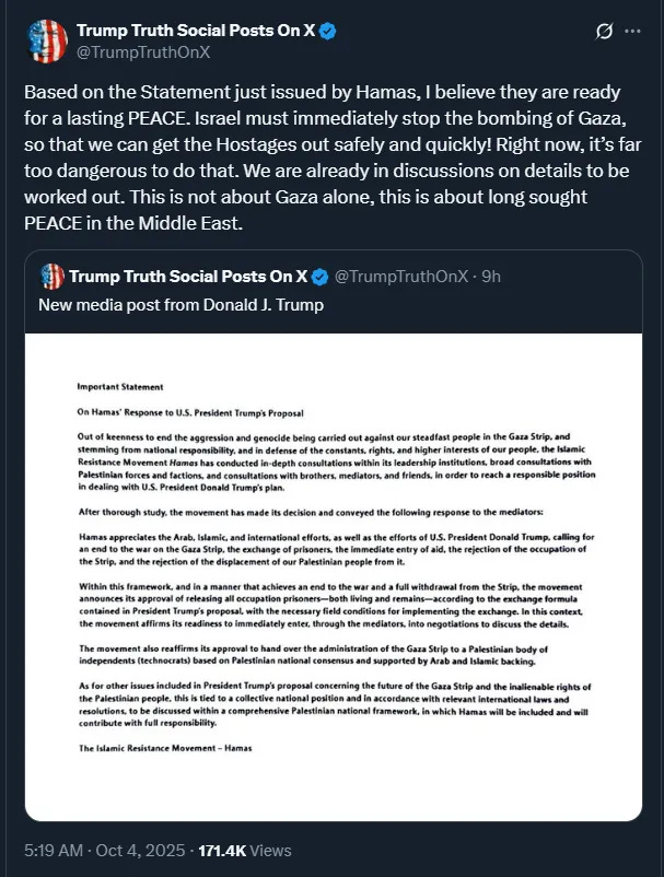 Hamas’ official statement was then published and, unexpectedly, received broad international welcome. Netanyahu, expecting Trump to reject it, was shocked when Trump publicly announced on social media that “Hamas is ready for lasting peace” and that Israel “must immediately stop the bombing.”