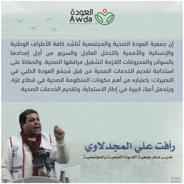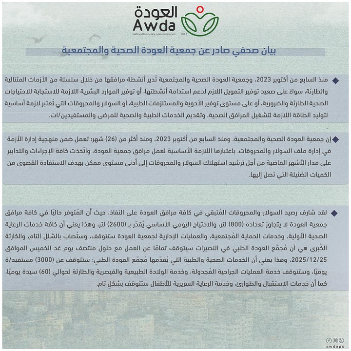 Al-Awda Health and Community Association had previously warned of an imminent shutdown of its facilities, citing an acute operational crisis caused by: