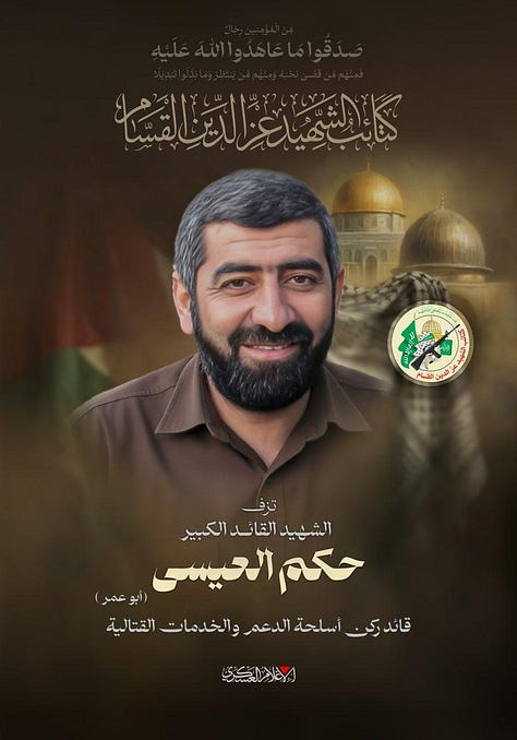 We further announce the martyrdom of the great commander Hakam al-Issa (“Abu Omar”), the devoted migrant mujahid, the humble, God-fearing leader—modest among his brothers, firm and courageous in the fields of confrontation—who traveled across lands carrying the trust of jihad in Palestine, known in Lebanon, Syria, and other places, before finally settling in Gaza of honor to continue the path of jihad and transfer his experience to his fellow mujahideen in Palestine. He held various leadership positions, most notably in training, the military institutes and colleges authority, and finally the combat weapons division.