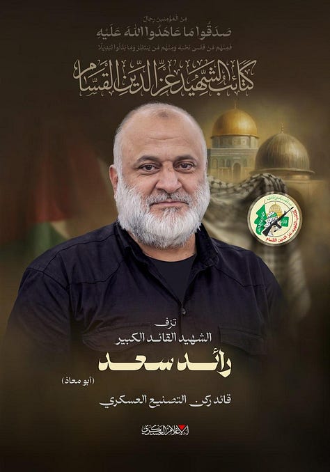 We also announce the martyrdom of the great commander who recently joined this caravan, the martyred Sheikh Raed Saad (“Abu Muadh”), Head of the Manufacturing Division in the Al-Qassam Brigades and former Head of the Operations Division. A dignified, God-fearing sheikh known to the fields of jihad since the earliest days, he labored day and night in giving and sacrifice—leading the First Gaza Brigade, then moving through various leadership positions and multiple fronts of jihad—until he concluded his journey by leading the military manufacturing system that produced Al-Qassam’s weapons independently, with Palestinian hands alone: from bullet to rifle, from rocket to explosive device and shell, from boat to drone. These weapons played a decisive role in the crossing of October 7 and the defensive battle that followed.
