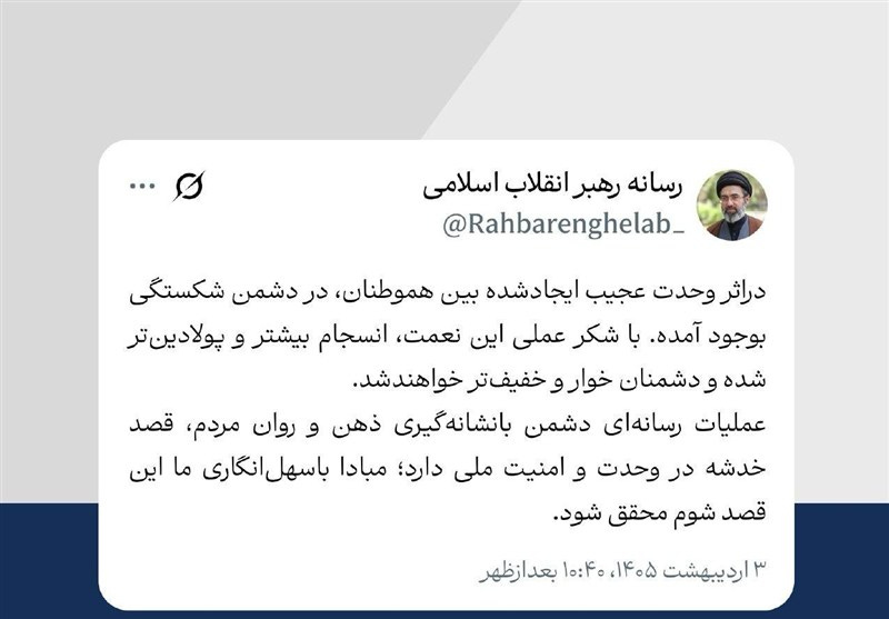 Iran, PUREWILAYAH.COM — The Leader of the Islamic Revolution, Ayatollah Seyyed Mojtaba Khamenei, stated that the growing unity among the Iranian people has begun to fracture the enemy, highlighting the strategic impact of national cohesion amid ongoing confrontation.