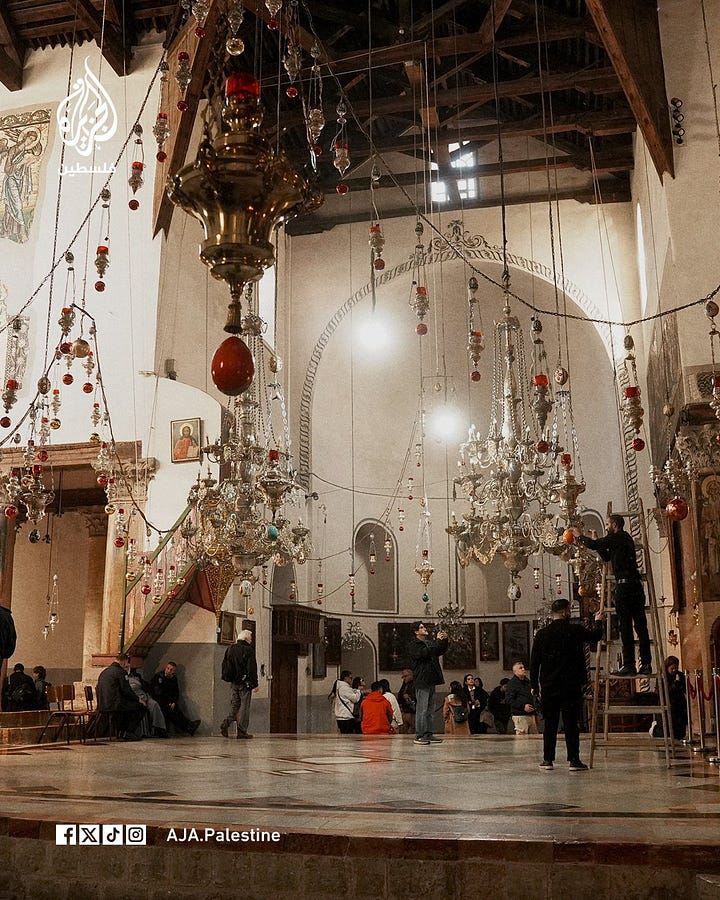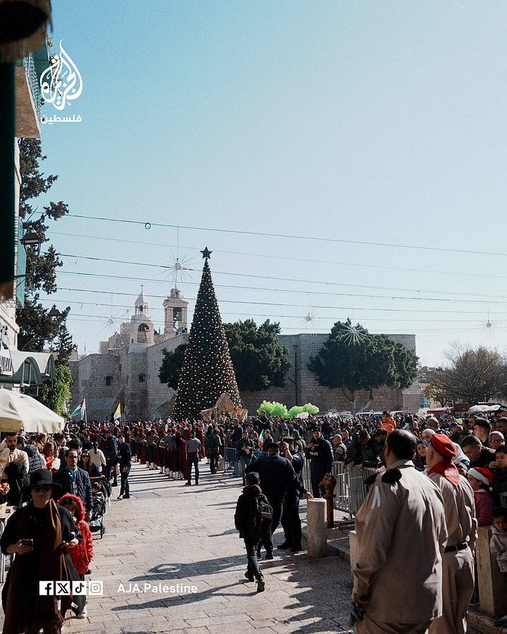 A large Christmas tree, decorated with red and gold ornaments, was erected once again in Manger Square, restoring a symbolic image long erased by war, siege, and collective grief.