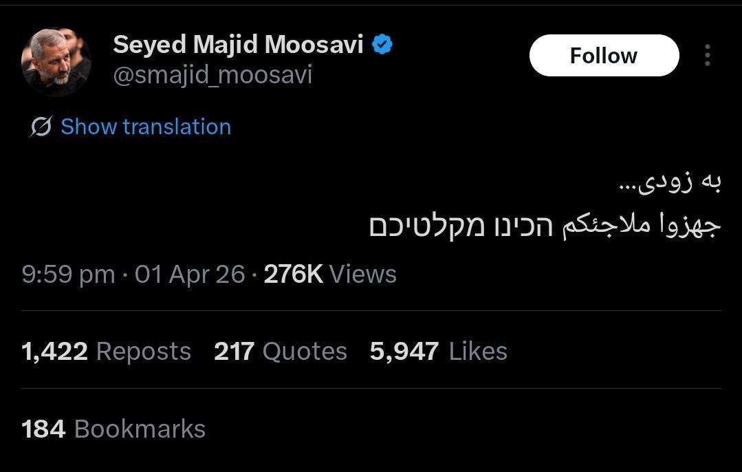 In a related development, Brigadier General Seyyed Majid Mousavi, commander of the IRGC Aerospace Force, issued a brief but pointed warning directed at adversaries, stating: “Soon… prepare your shelters.”