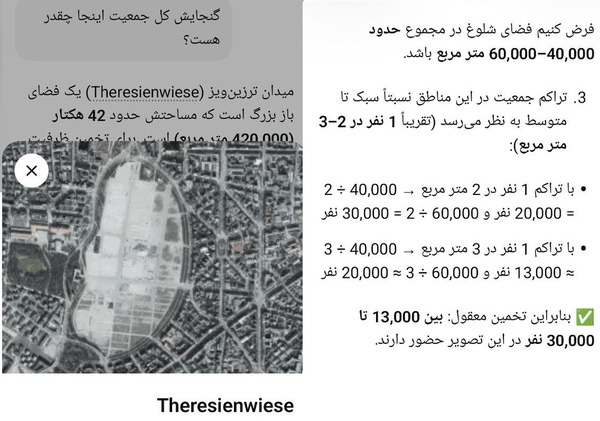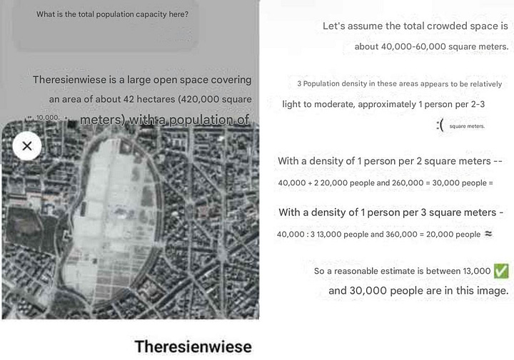 To expose the exaggeration, analysts used AI-generated density simulations as a reference tool, illustrating how Theresienwiese would appear if 250,000 people were actually present. These simulations showed an extremely dense, fully occupied field with virtually no empty space.