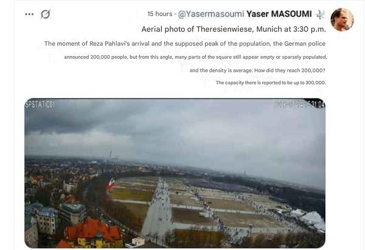 Visual evidence, spatial analysis, and AI comparisons expose inflated crowd claims, revealing the failure of Reza Pahlavi’s Munich mobilization.