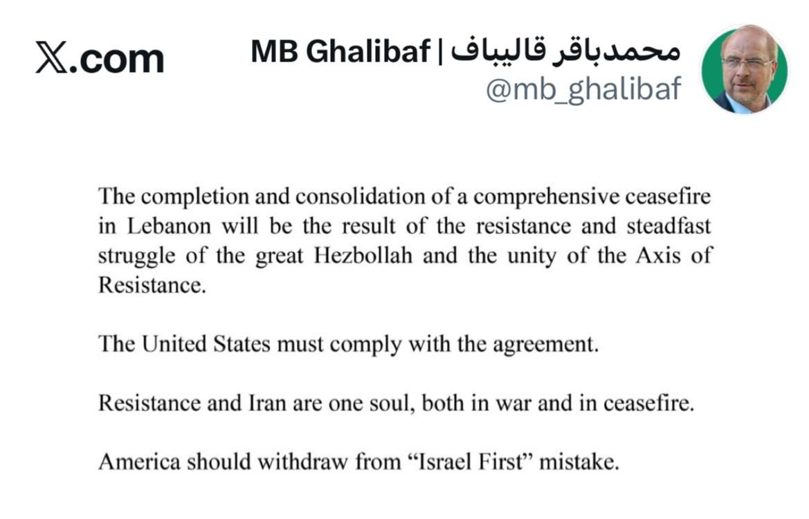 Iran, PUREWILAYAH.COM - Mohammad Bagher Ghalibaf stated in a message on X that the completion and consolidation of a comprehensive ceasefire in Lebanon will be the result of the steadfast resistance and fierce struggle of Hezbollah, along with the unity of the Resistance axis.