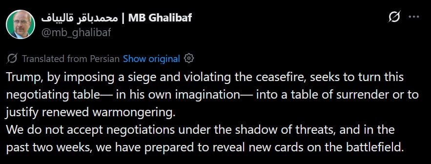 In a message published on social media, Ghalibaf said Donald Trump is using blockade measures and ceasefire violations to impose political outcomes.