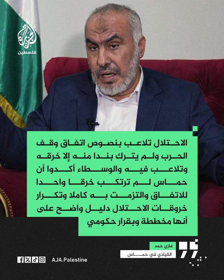 Dr. Ghazi Hamad says deliberate breaches over 66 days aim to impose a new reality of killing and terror, warns truce is nearing collapse