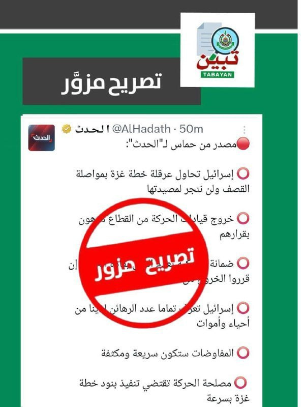 In its statement, Hamas said that certain news agencies and media platforms — citing an alleged source within the movement who had reportedly spoken to the Saudi network Al-Hadath — falsely claimed that Hamas had agreed to surrender its weapons following the end of the war in Gaza.