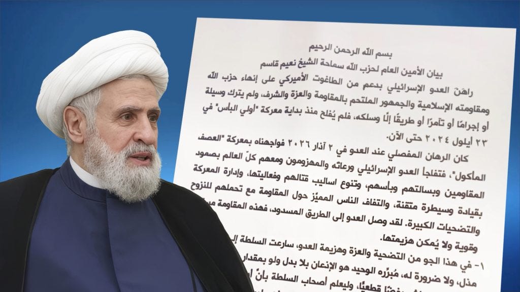 Sheikh Naim Qassem framed the crisis as a crisis of legitimacy, stating that no authority can endure while relinquishing national rights and confronting its own resistant society.