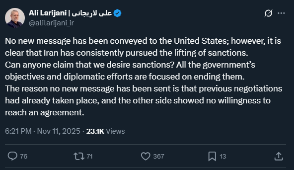 Larijani clarified that no new communication has been initiated because earlier rounds of negotiations had already taken place without meaningful progress.