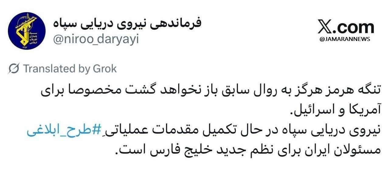 In the latest development, a social media account affiliated with the Naval Force of the Islamic Revolutionary Guard Corps (IRGC) announced that operational preparations for the new Persian Gulf order are nearing completion.