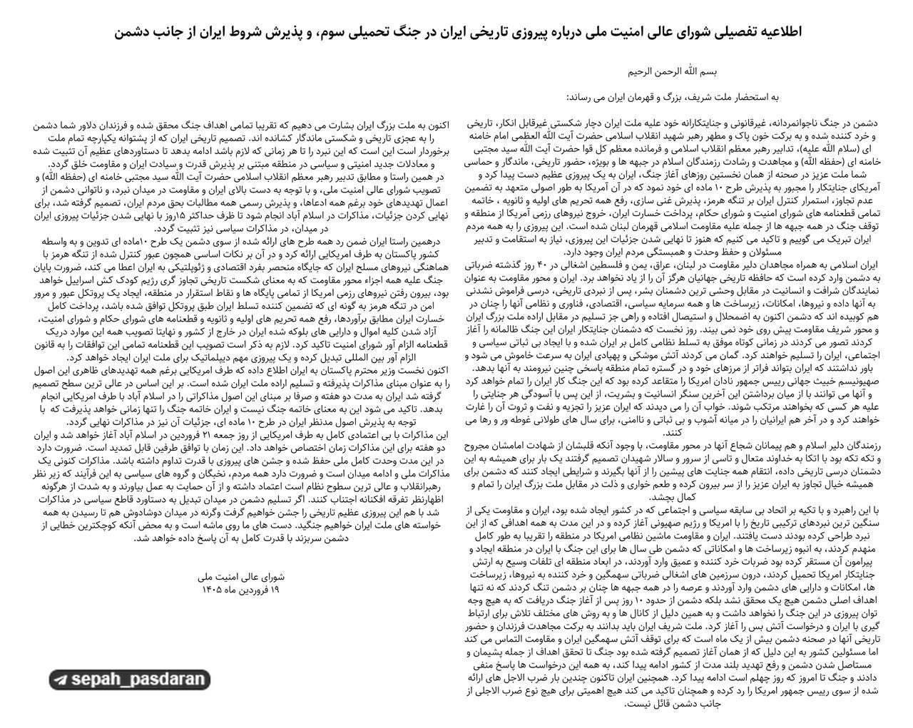 اکنون به ملت بزرگ ایران بشارت می دهیم که تقریبا تمامی اهداف جنگ محقق شده و فرزندان دلاور شما دشمن را به عجزی تاریخی و شکستی ماندگار کشانده اند. تصمیم تاریخی ایران که از پشتوانه یکپارچه تمام ملت برخوردار است این است که این نبرد را تا هر زمانی که لازم باشد ادامه بدهد تا دستاوردهای عظیم آن تثبیت شده و معادلات جدید امنیتی و سیاسی در منطقه مبتنی بر پذیرش قدرت و سیادت ایران و مقاومت خلق گردد.