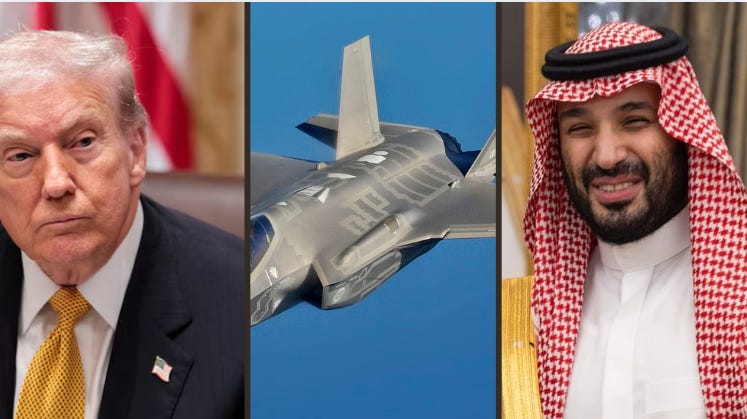 Trump has been pressuring Riyadh to move toward normalization “fairly shortly,” telling reporters aboard Air Force One that he plans to raise the issue directly with MBS during their meeting. Trump also confirmed he is considering a weapons deal that includes F-35 jets for Saudi Arabia.