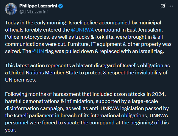 Lazzarini warns of a “dangerous precedent” after the forces storm UNRWA headquarters, replace UN flag with Israeli flag, seize equipment, and violate UN protections amid continued US-backed aggresion