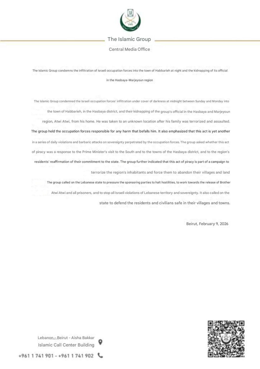The Islamic Group in Lebanon issued a statement through its Central Media Office condemning the abduction as a “criminal infiltration” and holding Israeli occupation forces fully responsible for Atwi’s safety.