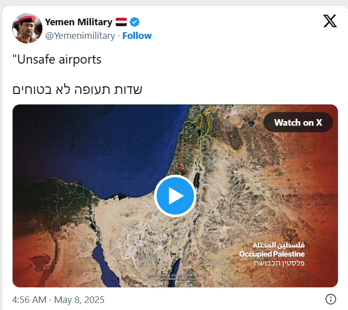 On May 8, the YAF released footage pinpointing three major Israeli airports, labeling them “unsafe,” and vowed continued retaliation after Israel’s military escalated attacks on Sanaa.