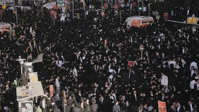 Channel 14 estimated that approximately 200,000 Haredim arrived in Jerusalem to oppose the compulsory draft law currently pursued by the occupation government.