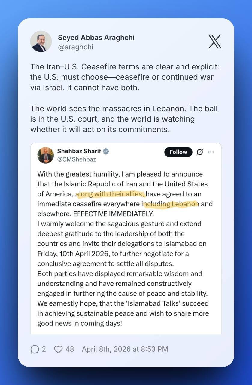 “The Iran–U.S. ceasefire terms are clear and explicit: the U.S. must choose—ceasefire or continued war via Israel. It cannot have both,” Araghchi stated.