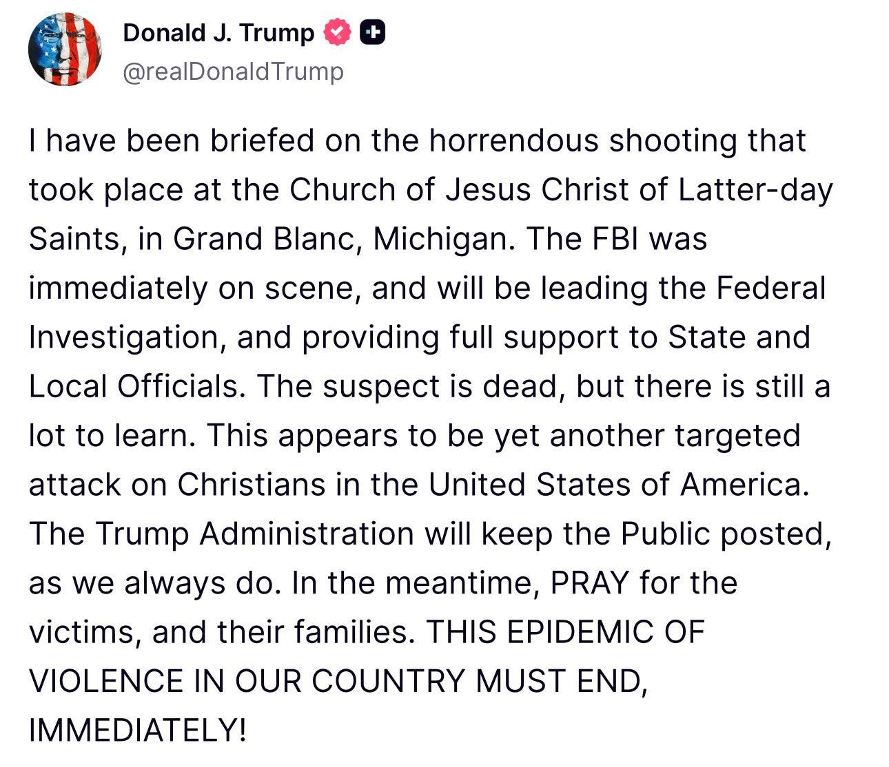 “The suspect is dead, but there is still a lot to learn,” Trump wrote. “This appears to be yet another targeted attack on Christians in the United States of America. THIS EPIDEMIC OF VIOLENCE IN OUR COUNTRY MUST END, IMMEDIATELY!”