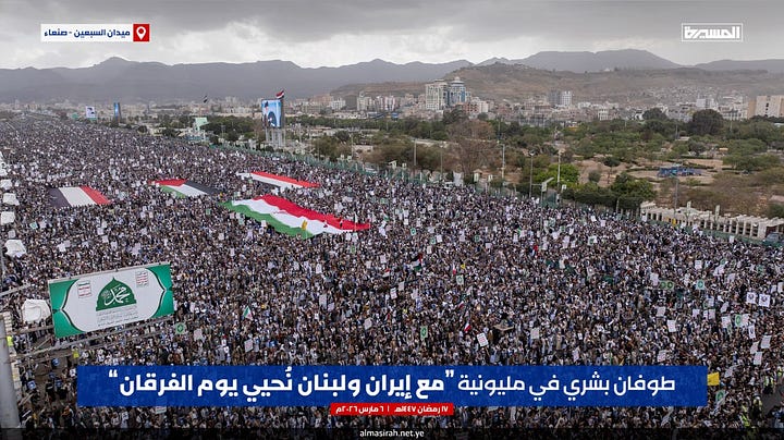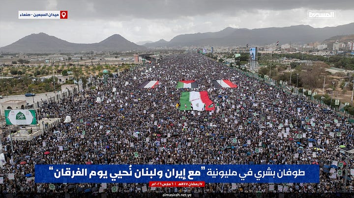 Huge crowds gather in Yemen’s capital to mark the Day of Furqan and express solidarity with Iran, Hezbollah, and resistance forces amid U.S.–Israeli escalation.