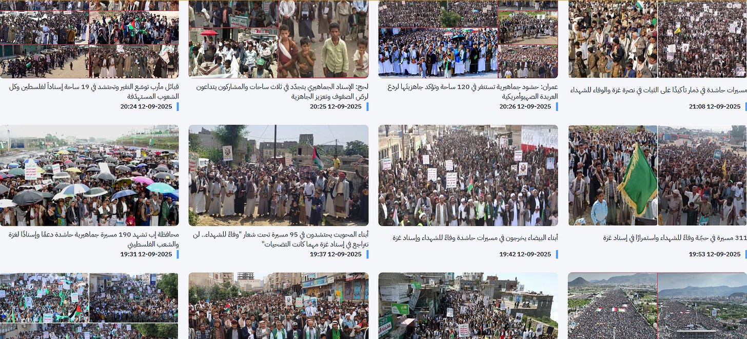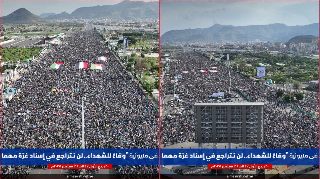 The million-strong marches concluded with a declaration that Yemen’s struggle is rooted in faith, loyalty to the Prophet, and fidelity to the martyrs. Gaza’s cause is Yemen’s cause, Al-Aqsa is a sacred duty, and resistance remains the chosen path until liberation and victory. (PW)