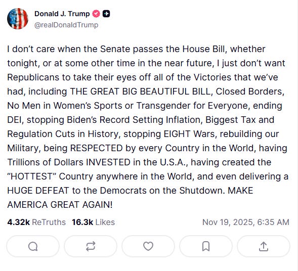 “I DON’T CARE!” he wrote on social media, insisting the scandal is a “Democrat problem” and urging Republicans to “get back on point.”