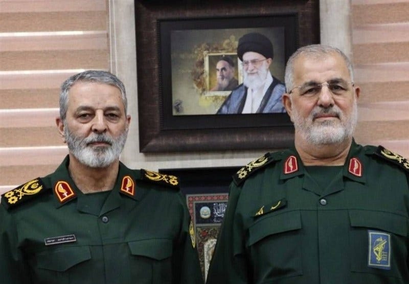 According to Tasnim News Agency, Major General Mohammad Hossein Mousavi, Chief of Staff of Iran’s Armed Forces, met with Major General Mohammad Pakpour, Commander of the Islamic Revolutionary Guard Corps (IRGC), to review defense capabilities and strategies.