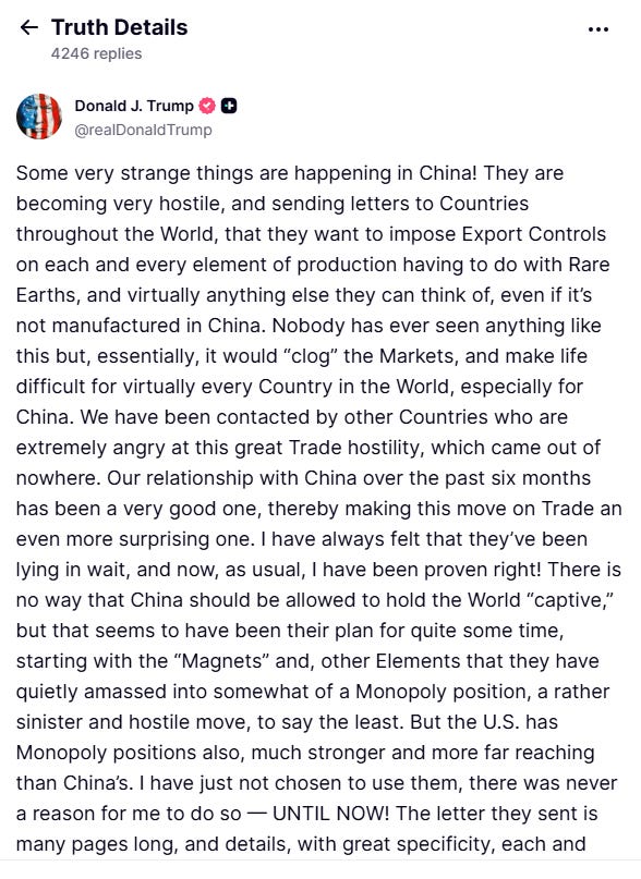 Responding on Truth Social, President Trump described China’s move as an “unprecedented and hostile” act. He stated that Washington is considering “a massive increase of tariffs” on Chinese imports as part of potential countermeasures.