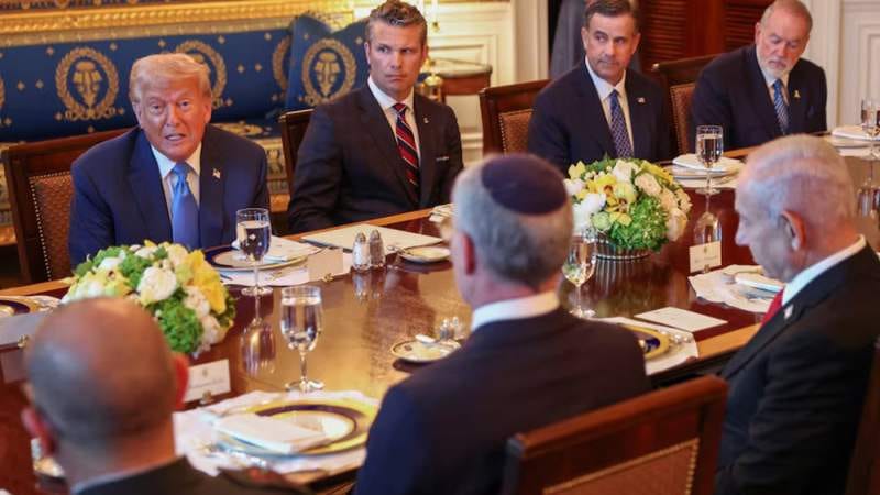 While addressing reporters prior to their dinner at the White House, Trump was asked about the status of his proposal to "take over" Gaza and forcibly remove the population of the Strip. He asked Netanyahu to respond to the question.