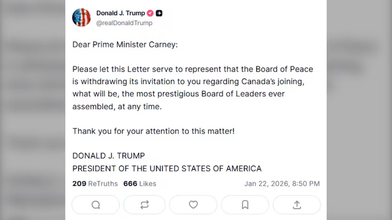 “Dear Prime Minister Carney: Please let this Letter serve to represent that the Board of Peace is withdrawing its invitation to you regarding Canada’s joining what will be the most prestigious Board of Leaders ever assembled, at any time.”