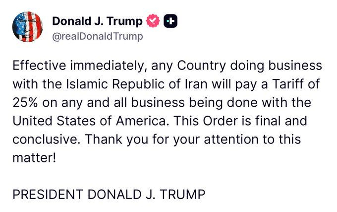 “Effective immediately, any Country doing business with the Islamic Republic of Iran will pay a Tariff of 25% on any and all business being done with the United States of America. This Order is final and conclusive,” Trump wrote, issuing what amounts to a global economic ultimatum.