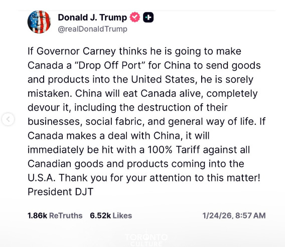 Trump Threatens 100% Tariff on Canada Over China Ties