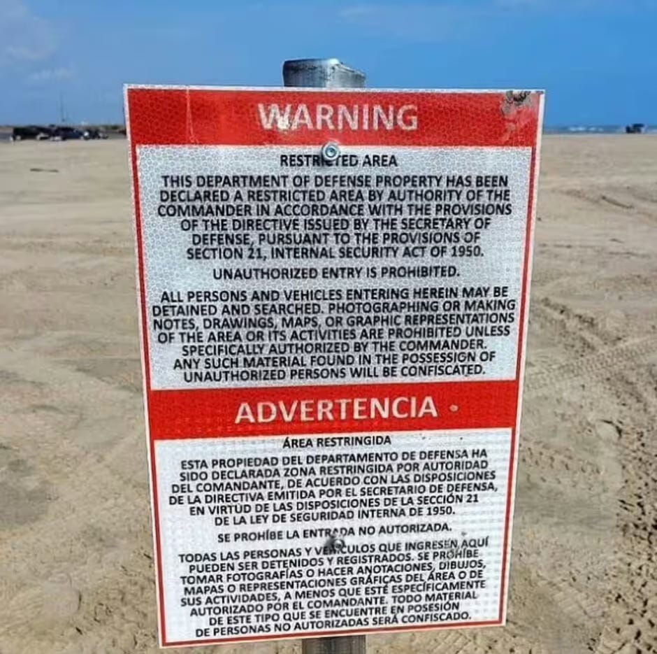 The unidentified men — reportedly US “contractors” — arrived by boat and immediately drove six metal signs into the sand, declaring the beach a “Restricted Area” belonging to the US Department of Defense. The wording threatened that unauthorized entry was prohibited.