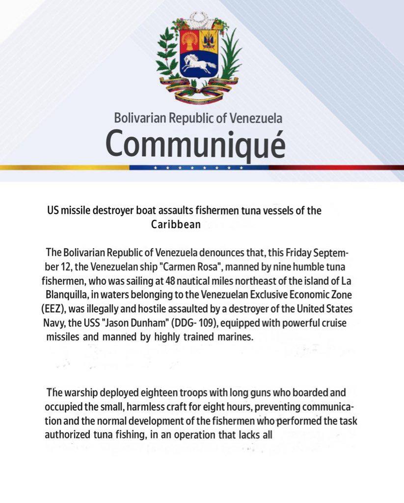 Venezuela, PUREWILAYAH.COM - The Bolivarian Republic of Venezuela denounced this Saturday that the US Navy missile destroyer USS Jason Dunham illegally assaulted a Venezuelan fishing vessel in the country’s jurisdictional waters, in what Caracas described as a provocation aimed at generating tensions in the region.