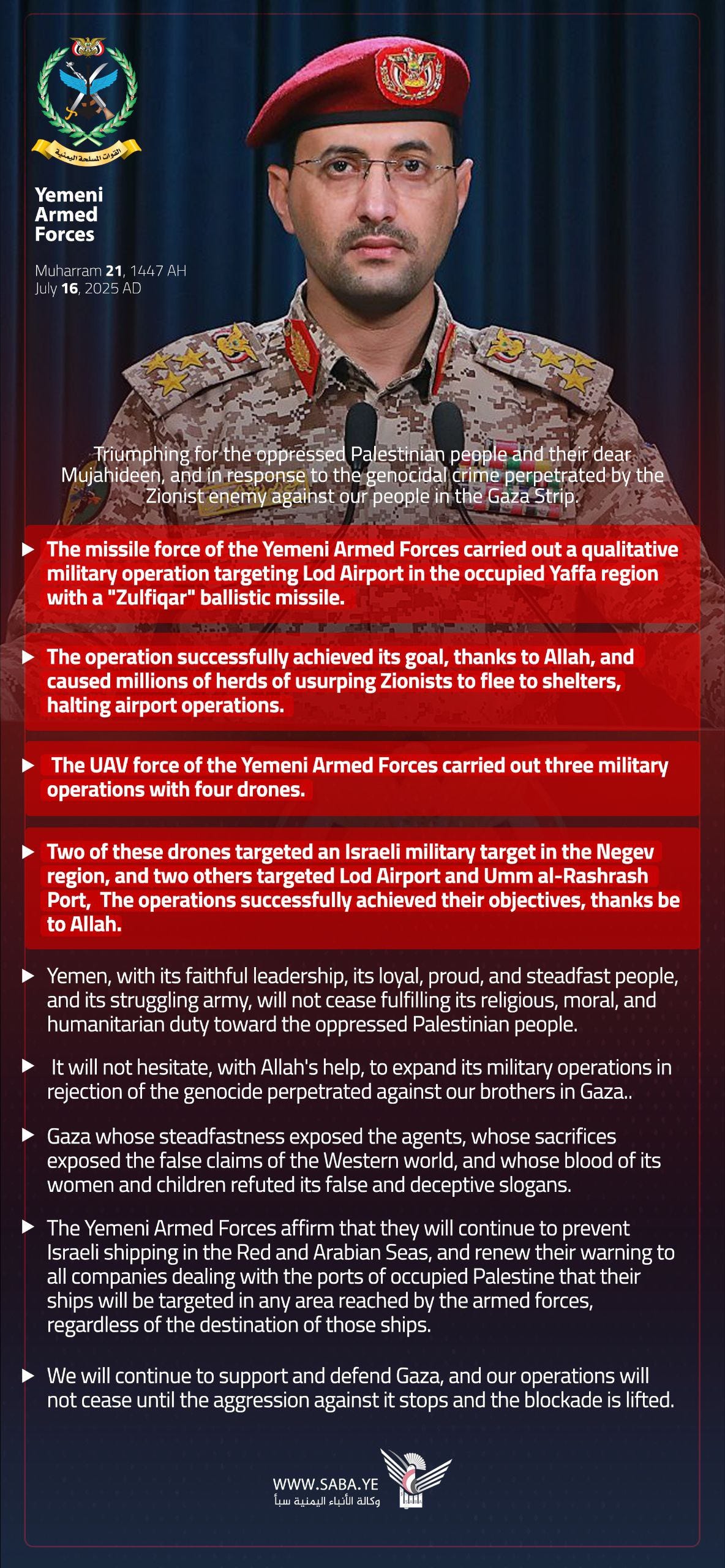 According to military spokesperson Brigadier General Yahya Saree, the most notable operation included a direct missile strike on the occupied airport of al-Lydd—known to the Israeli occupation as Ben Gurion Airport—using a Zulfiqar ballistic missile.